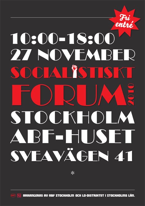Den 27 november är det dags för Socialistiskt forum på ABF-huset i Stockholm. Forumet är den största årliga mötesplatsen för vänsterrörelser i Sverige. Behovet av samtal, förståelse, idédebatt och analys har sällan varit större än nu, efter två förlorade val och en historiskt svag arbetarrörelse. På programmet finns över 70 programpunkter att välja mellan. Själv tänker jag förstås gå på Ung Vänsters seminarium om Vänstern och framtiden (som jag f.ö. ska moderera, så dumt vore det väl om jag inte gick på den). Ida Gabrielsson, Ali Esbati och Aron Etzler är paneldeltagare som ska få berätta hur de tänker om det politiska läget, vänsterns ställning och strategier och politik som kan stärka våra positoner.